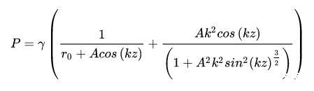 這里,是未受到擾動的水柱半徑,A表征擾動的大小,而k是波數(shù),表示擾動范圍的大小。很容易,我們可以計(jì)算出兩個(gè)方向的曲率半徑,進(jìn)而根據(jù)Young-Laplace方程計(jì)算出流體內(nèi)部各處的壓力(我們假定外壓為零):