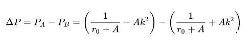 我們可以看到,在不同的地方,柱面的曲率都發(fā)生了變化,這種變化和表面張力一起,就導(dǎo)致了水柱當(dāng)中不同地方內(nèi)部壓力的變化。那么,我們?nèi)绾闻袛噙@種影響呢?我們說,如果A點(diǎn)(柱半徑縮小的地方)的壓力上升,B點(diǎn)壓力下降,那么: