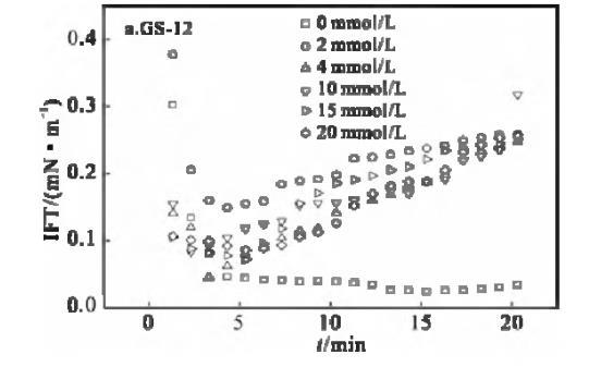 表面活性劑/油體系的動態界面張力行為,對驅油過程具有重要意義。動態界面張力是驅油過程中各種復雜物理化學反應的具體體現。因此,研究動態界面增長力及其影響因素非常重要。溶液中離子強度增加,將影響表面活性劑分子在水相中的溶解度,改變雙電層參量,而導致油水界面表面活性劑濃度的改變。一般情況下,添加的鹽可以通過中和表面活性劑分子在界面上頭基的電荷來減弱表面活性劑分子之間的靜電斥力,導致IFT降低[5]。溫度為30℃下,不同KBr鹽濃度下,GS-12,GS-16的煤油/表面活性劑溶液界面張力隨時間的變化曲線見圖6。