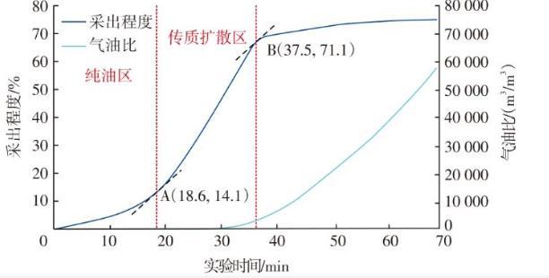 總結(jié)以上分析認(rèn)為,CO2驅(qū)生產(chǎn)動態(tài)規(guī)律為:在CO2驅(qū)替前緣未達(dá)到井口前采出端為純油流,此階段CO2-原油體系作用時間短,溶解降黏、萃取等作用效果不明顯,因此采油速度小、單井產(chǎn)量低且油井不見氣,如圖6中的純油區(qū),該區(qū)域主要依靠CO2驅(qū)動力采油,采出程度曲線呈緩慢上升驅(qū)勢。隨著開發(fā)推進(jìn),CO2-原油體系作用時間增加,溶解降黏、萃取等作用逐漸占據(jù)主要作用,原油黏度減小,此時油井開始緩慢見氣。如圖6中的傳質(zhì)擴(kuò)散區(qū),油井產(chǎn)量增加,采油速度加快,采出程度曲線快速上升。在純油區(qū)向傳質(zhì)擴(kuò)散區(qū)過渡階段,采出程度曲線上存在一切點(圖6中A點),其對應(yīng)的時間18.6 min為見氣時間,對應(yīng)的采出程度14.1%為純油區(qū)推進(jìn)至井口時的采出程度。隨著CO2驅(qū)的持續(xù)進(jìn)行,傳質(zhì)擴(kuò)散區(qū)大部分已經(jīng)推進(jìn)至采油井附近,油井產(chǎn)氣量迅速增大的同時產(chǎn)油量迅速減小,采出程度緩慢增加直至穩(wěn)定。在傳質(zhì)擴(kuò)散區(qū)采出的末段,采出程度曲線上存在一切點(圖6中B點),該點所對應(yīng)的時間37.5 min近似為驅(qū)油結(jié)束時間,此時對應(yīng)的采出程度71.1%為傳質(zhì)擴(kuò)散區(qū)推進(jìn)至井口時的采出程度。此后氣油比迅速增大,CO2驅(qū)油進(jìn)入末期。