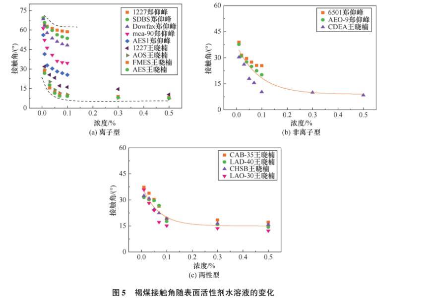 圖5褐煤接觸角隨表面活性劑水溶液的變化