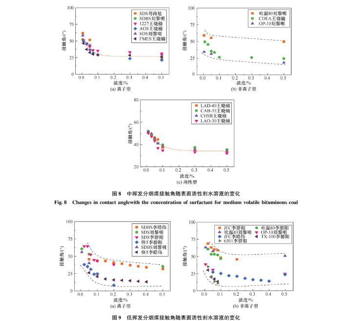 圖9低揮發分煙煤接觸角隨表面活性劑水溶液的變化