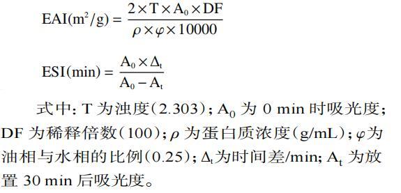 蛋清蛋白的乳化活性指數(shù)(emulsifying ability index,EAI)和乳化穩(wěn)定性(emulsifying stability index,ESI)測(cè)定。制備不同pH(2.0、4.0、6.0、8.0、10.0)含1%(w/v)蛋清蛋白的溶液,取15 mL溶液與5 mL玉米油混合,在10000 r/min條件下高速均質(zhì)1 min。分別在0、30 min時(shí)從離心管底部取50μL溶液,加入到4950μL 0.1%SDS溶液中,渦旋5 s混勻,立即在500 nm波長(zhǎng)處測(cè)定吸光度。