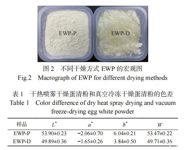 如圖2所示,EWP-P為細膩的鵝黃色顆粒粉末,EWP-D為松散的黃色片狀物。EWP-P的L*、a*和b*值分別為53.90±0.23、?2.06±0.70和6.04±0.21。EWP-D的L*、a*和b*值分別為49.89±0.36、?1.65±0.26和3.84±0.50(表1)。EWP-P的b*值較大是因為蛋清蛋白中的葡萄糖在噴霧干燥過程中與蛋白發生了美拉德反應。此外,真空冷凍干燥需將樣品進行冷凍預處理,冷凍過程中,蛋清蛋白會發生褐變反應,故EWP-D最終呈現出的顏色較EWP-P黃(圖2)。EWP-P的顏色較EWP-D白(圖2),可能是因為干熱噴霧干燥的干燥速度快,蛋清中的蛋白質受熱時間短。因此在本實驗干燥條件下,干熱噴霧干燥所得的蛋清蛋白粉更亮、更白,易被消費者接受。