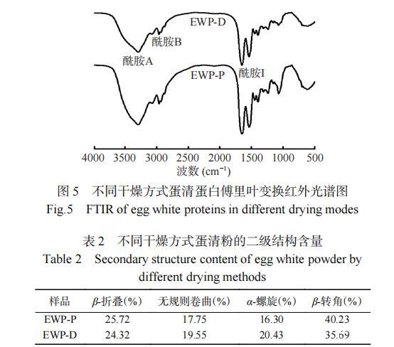 不同干燥方式蛋清蛋白的紅外光譜如圖5所示。EWP-P和EWP-D在酰胺A帶(3700~3200 cm?1)處有強吸收峰,EWP-P的峰強大于EWP-D,表明干燥方式會影響蛋清蛋白的水合能力,這可能與蛋白質分子中N-H鍵舒展并與氫鍵形成了締合體,或蛋白質分子與葡萄糖以共價鍵結合有關。酰胺B帶(2961.64 cm?1)的弱吸收峰主要由C-N鍵產生。酰胺I帶(1600~1700 cm?1)信號主要由C-O鍵伸縮振動引起,與蛋白質的二級結構有關,涉及β-折疊(1600~1640 cm?1)、無規則卷曲(1640~1650 cm?1)、α-螺旋(1650~1660 cm?1)和β-轉角(1660~1700 cm?1)。采用Peak fit軟件對不同干燥方式蛋清蛋白的酰胺I帶峰強進行高斯曲線擬合分析,根據峰面積計算其二級結構的相對百分含量,結果如表2。EWP-P和EWP-D的二級結構以β-折疊和β-轉角為主,EWP-P的β-折疊含量增加主要與卵轉鐵蛋白熱變性有關,同時分子間的β-折疊結構也易轉變為β-轉角結構。而α-螺旋下降可能是因為熱變性導致α-螺旋中的氫鍵斷裂,進而發生了解螺旋現象。EWP-P無規則卷曲增加,表明其部分有序結構向無規則卷曲轉化,蛋白變性明顯,結構的隨機性增強。