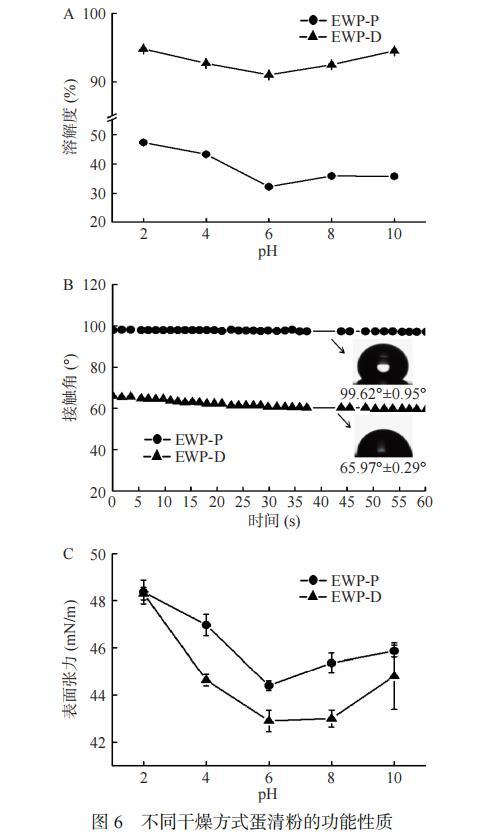 溶解性是蛋白重要的功能特性之一,與接觸角、表面張力、乳化性等密切相關。如圖6A,不同pH下不同干燥方式的蛋清粉溶解度的測量。EWP-P的溶解度隨著pH的升高先減小后增大,這可能是因為在酸性和堿性環境中球狀蛋白質會發生部分展開,形成熔融球狀構象,變得更加靈活,更容易與水分子作用。pH為6.0時蛋清蛋白的溶解度最低,可能是因為該pH與蛋清蛋白中大部分蛋白的等電點相近,蛋白帶電荷量較少,因此容易發生沉淀。與EWP-P相比,EWP-D在pH6.0時溶解度的下降程度較小,這可能與真空冷凍干燥后蛋清蛋白的微觀結構呈片狀,具有較大的比表面積有關,也可能是因為冷凍干燥蛋白質在脫水過程中蛋白質變性低,促進了可溶性聚集物生成。EWP-D的溶解度遠大于EWP-P,這是因為噴霧干燥是直接將蛋清液霧化后再干燥,其蛋清粉表面會形成一個光滑、抗濕性的薄膜,最終導致蛋白的溶解性降低,復水性差且易結塊。而真空冷凍干燥經過冷凍升華,可保持食品原有的形狀故具有很好的速溶性和復水性。Shaviklo等也發現噴霧干燥的含添加劑(花粉)蛋白的蛋白質溶解度明顯低于凍干蛋白。