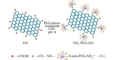NH2-PEG-GO的制備方法:使用8-arm-PEG-NH2對GO表面進行修飾(圖1)。取80 mL上述細胞破碎機處理后的GO溶液,加入16 mL質量濃度為2 mg/mL EDC來活化GO表面羧基,然后將混合溶液在功率為570 W條件下超聲30 min(開1.5 s,關1 s),待分散均勻后,再用5%NaOH溶液來調節(jié)溶液酸堿性(pH=8),隨后將240 mg 8-arm-PEG-NH2加入,超聲反應30 min后,再常溫攪拌反應12 h,離心水洗后得到氨基修飾的GO,于室溫真空冷凍干燥2 d后,得到最終產(chǎn)物,將產(chǎn)物研磨備用。