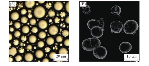 以DA-GQD為顆粒乳化劑、L-薄荷醇(熱熔)為油相制備的Pickering乳液的光學顯微鏡照片(OM)如圖5(A)所示。從圖5(A)可以看出,Pickering乳滴粒徑約為10μm,具有規則統一的球形形貌。由于DA-GQD具有較高的親水性,因此傾向于形成穩定的水包油型乳液。DA-GQD固體顆粒分散在薄荷醇/水界面,這是因為液-液界面的一部分被液-顆粒界面代替時總界面能降低,L-薄荷醇被微小的石墨烯片覆蓋,位于液滴的中心。
