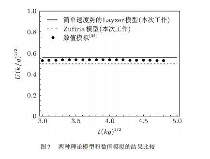 最后,我們將兩種理論模型的結(jié)果與數(shù)值模擬進行了比較,如圖7所示。在誤差允許的范圍內(nèi),Zufiria模型和Layzer模型與數(shù)值模擬符合的都很好。由簡單速度勢的Layzer模型得出的結(jié)果更接近于數(shù)值模擬。另外,從圖7中還可以看出,簡單速度勢的Layzer模型計算值比數(shù)值模擬結(jié)果高,而Zufiria模型比數(shù)值模擬低。這可能由于Zufiria模型假設(shè)速度勢是復(fù)數(shù)勢,會人為引進速度的耗散,導(dǎo)致結(jié)果比數(shù)值模擬低,而Layzer模型的計算值略高于數(shù)值模擬的原因可能由于數(shù)值模擬沒有達到漸近速度。