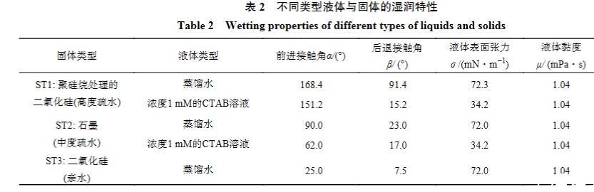 由于固、液兩相的表面特性會顯著影響固?液接觸角,從而影響液滴與顆粒的碰撞行為,筆者通過實驗測量和文獻分析,對比了固、液特性的變化對接觸角的影響。表1列出了測量固、液特性時所使用的具體儀器及添加劑。表2給出了不同固體和液體樣品的接觸角、表面張力和黏度。其中高度疏水固體ST1與不同液體接觸角通過實測得出,中度疏水固體ST2和親水固體ST3的測量數(shù)據(jù)來自ZHU等的研究。對比后發(fā)現(xiàn),前進接觸角α明顯大于后退接觸角β,所以在分析塵?霧濕潤特性時應(yīng)考慮前進角和后退角的差異。