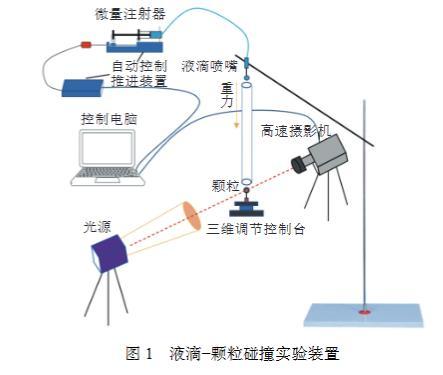 為確保每次實驗保持一致,實驗采用電自動微量注射器產(chǎn)生大小一致的實驗液滴,并通過調(diào)節(jié)不同高度的注射器來改變液滴?顆粒碰撞速度。為防止環(huán)境氣流對液滴軌跡的影響,在注射器下方設(shè)置了一個空心圓筒。在三軸光學平臺上設(shè)置了樣品顆粒支座,利用EVA熱熔膠將樣品顆粒固定在支座的金屬支撐絲上。顆粒的位置可通過三軸光學平臺進行調(diào)整。使用了Phantom VEO410L高速相機(Vision Research公司)對碰撞過程進行捕捉拍攝。相機和光源分別位于樣品顆粒的兩側(cè)。相機的拍攝頻率設(shè)定為2 000 fps,圖像分辨率為1280×800像素。