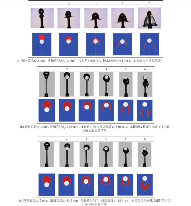 為進一步驗證本模型計算結果的可靠性,依據BANITABAEI等在實驗中設置的不同碰撞條件,開展了相應的數值模擬。如圖5b和圖5c所示,在不同碰撞條件下,數值模擬結果中的液滴形變過程與實驗結果均具有較高的吻合度。圖6對比了數值模擬結果與實驗結果中液滴幾何尺寸的變化過程,也具有較高的吻合度。其中,圖6a所展示的液膜底部直徑隨時間變化曲線,數值模擬結果與實驗結果稍有偏差,原因是實驗中固定顆粒的支撐柱對液膜底部的形變過程產生了一定影響。綜上所述,可認為筆者構建的數值模擬模型合理,結果具有較高可靠性。由于在毫米尺度下和微米尺度下,液滴與固體顆粒的碰撞過程均遵守經典牛頓力學定律和經典流體力學理論,所以本數值模擬模型可用于微米尺度下的其他工況條件的數值模擬研究。