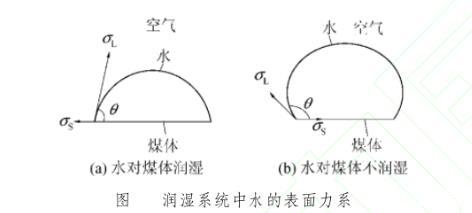 式中,θ為水與煤表面的接觸角,它是指在固、液、氣三相交界處,自固-液界面經液體內部而到液-氣界面的夾角。如果接觸角θ<90°屬可濕潤煤體,在相同的水表面張力系數條件下,θ角愈小,毛細作用力則愈大,增強了注水動力,潤濕能力愈大;若濕潤邊角θ>90°屬于不可濕潤煤體,θ角愈大,潤濕能力愈小。