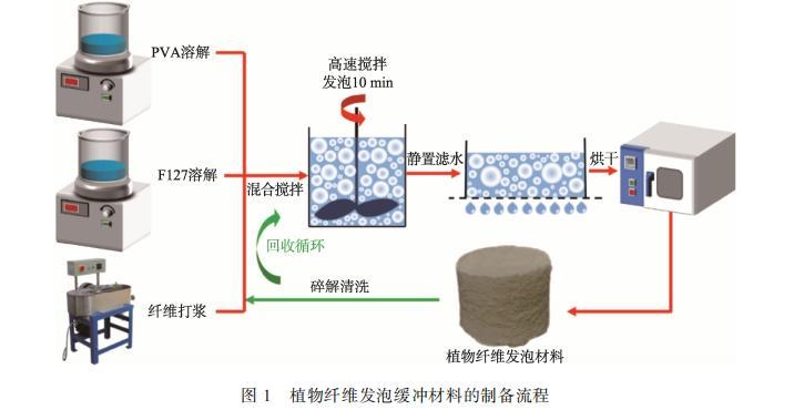 將375 g木纖維漿板泡入23 L去離子水中12 h,使用瓦力打漿機(jī)細(xì)化30 min,得到打漿度(°SR)為20的闊葉木纖維。將纖維與PVA、F127按不同比例混合,加入去離子水形成懸浮液。將懸浮液在5000 r/min下高速分散10 min,隨后倒入帶有100目篩網(wǎng)的模具中排水12 h,脫模后在100℃干燥12 h,獲得植物纖維發(fā)泡材料。