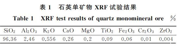 本試驗所用的單礦物石英取自某礦廠,將制備后的石英單礦物樣品進行X射線衍射(XRD)分析、X射線熒光光譜(XRF)分析和激光粒度分析,XRD的分析結果如圖1(a)所示,XRF的分析結果見表1,粒度分析如圖1(b)所示。從圖1(a)可以看出,石英單礦物SiO?峰強度以及密度最高,說明SiO?占主導地位。從圖1(b)可以看出,樣品的中值粒徑D??達到了133.5μm,D??則達到了264.3μm.綜合上述礦物的純度以及粒度,石英可滿足后續單礦物試驗以及機理分析的要求。