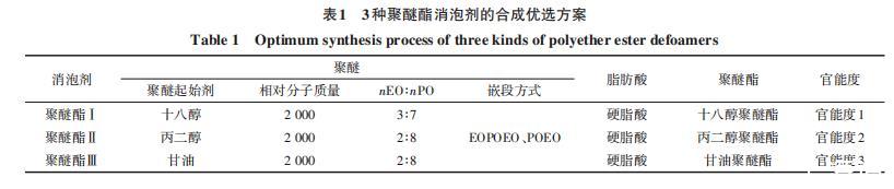 表1 3種聚醚酯消泡劑的合成優選方案