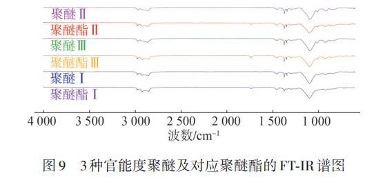 圖9為3種官能度的聚醚和聚醚酯FT-IR譜圖。由圖9可以看出,在3種官能度聚醚的FT-IR譜圖中,1 737 cm?1處均無特征峰,而3種官能度聚醚酯在1 737 cm?1處均有特征峰,為酯基C==O的吸收峰,說明3種官能度聚醚末端的醇羥基已經與脂肪酸發生反應。2 971 cm?1處的特征峰表明有—CH?存在,2 857和1 455 cm?1處的特征峰表明存在—CH?—,1 296 cm?1處的特征峰則為—CH?的彎曲振動峰,在1 097 cm?1處的C—O—C伸縮振動峰較明顯,表明聚醚酯中醚鍵較多。