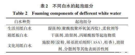 表2為不同種類白水的主要起泡組分,圖7為3種聚醚酯消泡劑在生活用紙白水、箱紙板白水和文化用紙白水中的消泡性能。由表2可知,不同種類白水的起泡組分存在明顯差異,因此本研究分別討論不同種類白水中,不同聚醚酯消泡劑的消泡性能。