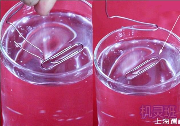 而當(dāng)你把洗潔精滴入水里,會(huì)破壞水的表面張力,使得水的表面張力不足以支撐回形針,因此回形針會(huì)下沉至玻璃杯的底部。