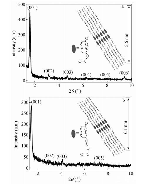 在2θ=2°~10°范圍內(nèi)出現(xiàn)的多個(gè)等距離Bragg衍射峰表明得到的CODA和CO2DA LB膜具有很好的周期性結(jié)構(gòu)。假定從左至右Bragg衍射峰依次為(001),(002),...,(006),用Bragg方程對各級衍射峰進(jìn)行計(jì)算可得CODA和CO2DA LB膜層狀結(jié)構(gòu)間距為5.6nm和6.1nm。CO2DA LB膜的Bragg衍射峰較寬,強(qiáng)度較弱,Bragg衍射峰隨角度的增大衰減很快,說明CO2DA LB膜中分子排列較CODA LB膜中松散,存在局部的缺陷。理論計(jì)算充分展開的CODA和CO2DA分子鏈長約為3.5nm和3.6nm,所以觀察到的周期結(jié)構(gòu)包含雙層的CODA和CO2DA分子。我們可以預(yù)想雙層結(jié)構(gòu)的中間區(qū)域是香豆素基團(tuán)經(jīng)過強(qiáng)烈的π-π堆積作用形成的,而雙層結(jié)構(gòu)單元的外部為烷基側(cè)鏈。香豆素取代二乙炔單體的規(guī)則排列是二乙炔單元進(jìn)行拓?fù)渚酆系南葲Q條件。