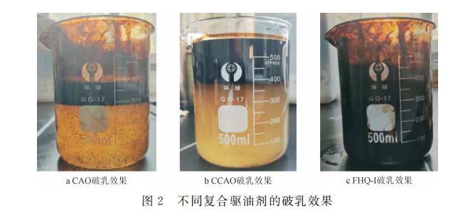 取一定量的CAO、CCAO或FHQ-I以及約35%的原油分別和65%的模擬地層水置于500ml燒杯中,將燒杯放入30℃六速攪拌器中,以200r/min的速度恒溫攪拌20min,使其完全乳化,破乳效果如圖2所示。