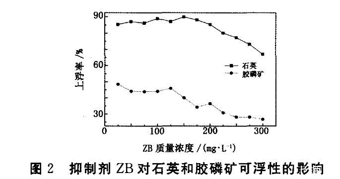 從圖2看出,ZB對膠磷礦和石英的抑制效果明顯,當ZB用量為150 mg/L時,兩者上浮率差異達到最佳,為54.90個百分點。與圖1對比可知,使用ZB做調整劑時,可在用量較低時得到更好的抑制效果。并對添加ZB后的礦漿pH值進行測定,當ZB用量達到150 mg/L時,礦漿pH為1.2左右;當ZB用量超過200 mg/L時,石英上浮率仍保持在70%以上,說明使用ZB不會造成石英上浮率明顯下降,更有利于膠磷礦和石英的有效分離。