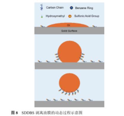 如圖8所示,SDDBS剝離油膜機(jī)理可從以下三個方面進(jìn)行闡釋,首先SDDBS吸附在油水界面上降低了油水界面張力;其次,SDDBS的二羥基通過氫鍵作用強(qiáng)化了其與巖石表面吸附,磺酸基團(tuán)富集于巖石表面使得巖石表面由親油轉(zhuǎn)變?yōu)閺?qiáng)親水,極大地增加了油滴在巖石表面接觸角,降低粘附功而使得油膜易于剝離;最后,由于SDDBS在油水界面和巖石表面同時吸附,增加剝離后油滴與巖石表面間的靜電斥力,使得剝離后油膜不易重新粘附壁面,實(shí)現(xiàn)高效剝離。