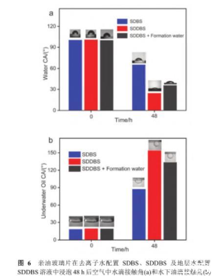 圖6親油玻璃片在去離子水配置SDBS、SDDBS及地層水配置SDDBS溶液中浸泡48 h后空氣中水滴接觸角(a)和水下油滴接觸角(b)
