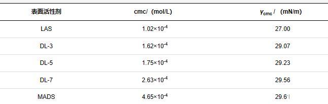 表2給出了混合磺酸鹽的臨界膠束濃度(cmc)和cmc時(shí)的表面張力(γcmc),可以看出,LAS展現(xiàn)出最佳的表面活性,隨著混合磺酸鹽中MADS含量的增加,cmc和γcmc呈增加趨勢(shì),這是由于MADS分子中含有2個(gè)磺酸基團(tuán),親水性強(qiáng),分子間靜電斥力大,不利于膠束的形成,且在氣/液排列時(shí)分子疏松,裸漏的-CH3密度小,即γcmc較高。