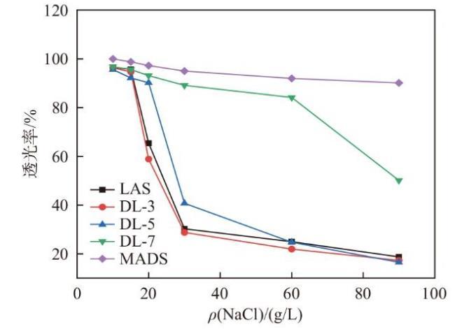 在許多工業(yè)應(yīng)用中,水中含有大量的鹽類,例如在石油天然氣開(kāi)采、海洋設(shè)備清洗或污水處理等場(chǎng)景中[2,7]。耐鹽型表面活性劑能夠保持在高鹽環(huán)境下的化學(xué)穩(wěn)定性,避免沉淀或失效,確保其清洗能力不受影響,因此探究表面活性劑的耐鹽性有重要意義。圖3給出了LAS、DL-n、MADS的耐鹽性透光率圖,可以看出,LAS的耐鹽性最差,20 g/L NaCl時(shí)溶液渾濁,而MADS的耐鹽性最好,隨著混合磺酸鹽中MADS含量的增加,混合磺酸鹽的耐鹽性呈升高趨勢(shì),說(shuō)明MADS含量的提高有利于提高耐鹽性,這可能是由于無(wú)機(jī)鹽對(duì)陰離子表面活性劑的作用體現(xiàn)在離子頭基水化層的破壞作用,MADS分子中的雙磺酸結(jié)構(gòu)電荷密度大,屏蔽了NaCl的作用。