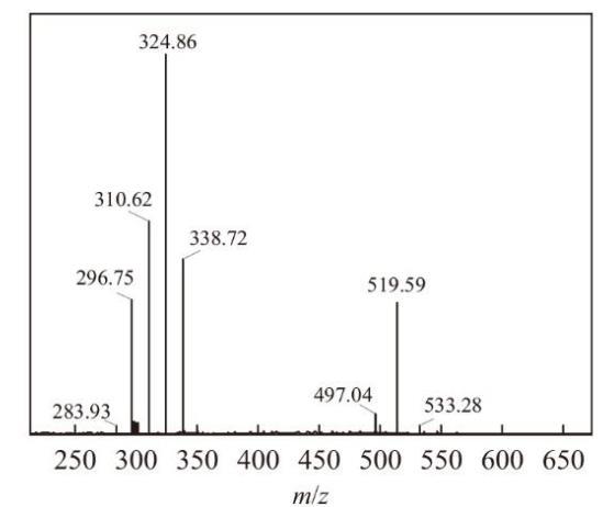 以DL-5為例,MADS的分子量M1=542,LAS為碳鏈C10~13的混合物,M分別是318,332,346,360。由圖1質(zhì)譜圖可以看出,離子峰m/z=519.59為失去一個(gè)鈉離子的MADS;離子峰m/z=296.75,310.62,324.86,338.72分別為失去一個(gè)鈉離子的C10~13烷基苯磺酸鹽,證明確為烷基二苯醚/烷基苯混合磺酸鹽。