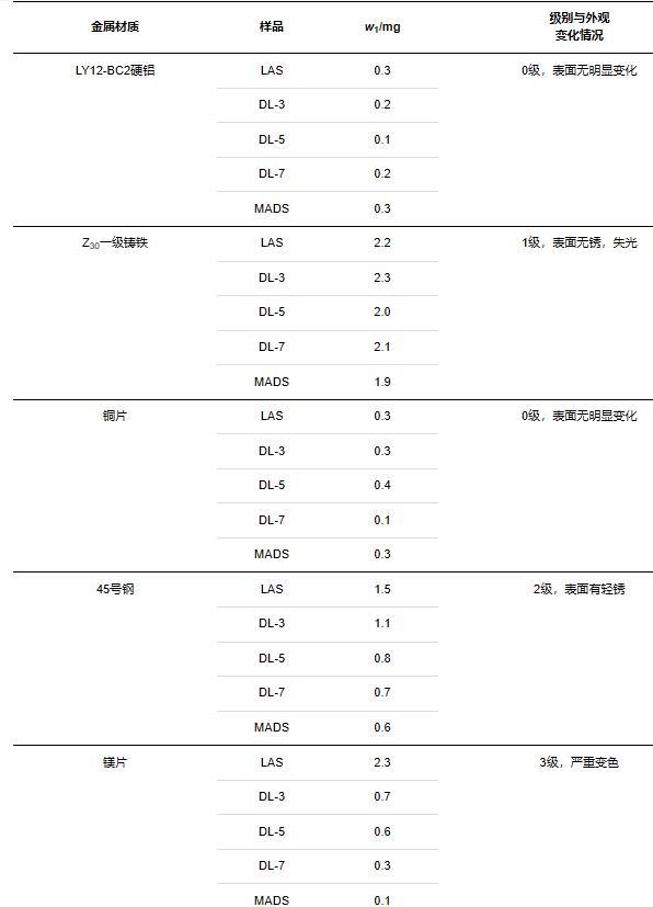 表面活性劑在使用過(guò)程中難免會(huì)接觸到金屬設(shè)備及容器,存在潛在的腐蝕問(wèn)題[11]。本研究選用LY12-BC2硬鋁、Z30一級(jí)鑄鐵、銅片、45號(hào)鋼、鎂片這5種不同的金屬試片來(lái)模擬不同的金屬環(huán)境,對(duì)LAS、DL-n系列、MADS表面活性劑溶液進(jìn)行金屬腐蝕性測(cè)試。通過(guò)觀察試片外觀變化以及腐蝕量計(jì)算來(lái)確定金屬腐蝕性級(jí)別。