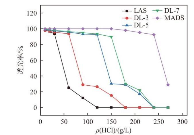 在許多工業(yè)過(guò)程中,表面活性劑會(huì)接觸到酸性環(huán)境,例如石油開(kāi)采中的酸化處理、金屬表面處理、酸性清洗劑等[8-10]。研究表面活性劑的耐酸性可以確保這些產(chǎn)品在酸性條件下仍能保持穩(wěn)定性和功能性,從而避免在苛刻條件下失效或分解。磺酸基團(tuán)為C-S鍵,與硫酸鹽類表面活性劑(如AES)相比,在酸性條件下較穩(wěn)定,不易分解。圖4給出了LAS、DL-n、MADS的耐酸性透光率圖,可以看出,隨著混合磺酸鹽中烷基二苯醚含量的增加,耐酸性逐漸增加。LAS耐酸性最差,MADS的耐酸性最好,在270 g/L時(shí)渾濁。混合磺酸鹽在結(jié)構(gòu)上并沒(méi)有發(fā)生破壞,發(fā)生渾濁是由于聚集體形態(tài)發(fā)生了變化,從而體現(xiàn)出溶液渾濁的現(xiàn)象。