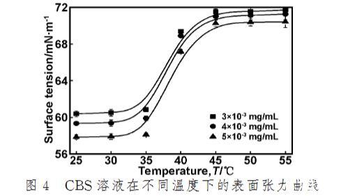 (3)CBS溶液的表面張力隨溫度的升高呈現兩種狀態。在低溫下,保持較好的表面活性,當溫度升高到一定程度(>35℃),由于變性作用,使得CBS的表面張力急劇增大。