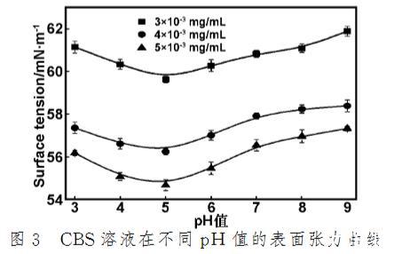 Terashima等發現腐殖酸的平衡表面張力隨其溶液pH值的增大而向低濃度方向移動。Jeong等人考察含羞草種子蛋白提取液在不同pH值條件下的表面張力時,發現其表面張力分別在4.0、7.0和9.0時出現最低值。圖3即為CBS溶液在不同pH值條件下的表面張力曲線。從圖3可以看出濃度越大,表面張力值越低;隨著pH值的增大,CBS溶液的表面張力先降低而后增加;在pH值5.0時表面張力最小,分別為59.63(3.0×10^-3 mg/mL)、56.24(4.0×10^-3 mg/mL)和54.27 mN/m(5.0×10^-3 mg/mL)。Lin等認為明膠衍生物在酸性中的表面活性比堿性好的原因是疏水性增強以及凈負電荷降低造成的。此外,Lambert等在研究pH值對β-葡糖苷酶的表面張力的影響時,結果表明其表面張力值在pH值3.5時最小,與其等電點相近。CBS的等電點為4.93,因此,在pH值為5.0時,CBS分子聚集成有序的分子組合,且靜電荷最低,最終導致表面張力最低。