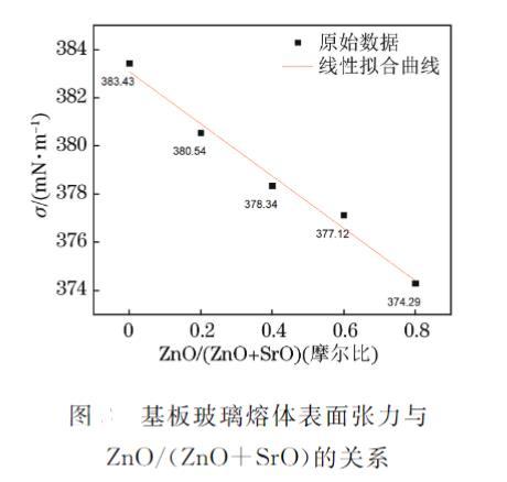 當 OLED 基板玻璃化學組成中的 ZnO/(ZnO+SrO) 摩爾比在 0~0.8 范圍內變化時,玻璃熔體在 T? 溫度條件下表面張力的測量和擬合結果如圖 7 所示。