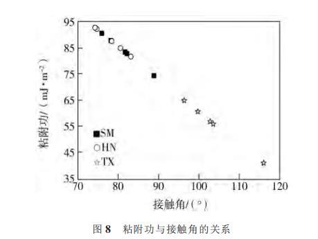 將接觸角θ與γlg代入式(9)可得煤顆粒與水的粘附功,結果見圖7。由圖可知,隨著超細粉碎時間的延長,煤-水體系的粘附功的變化趨勢與接觸角的變化趨勢相反。3種煤樣的接觸角與粘附功的關系見圖8。由圖可知,隨著接觸角的增大,煤-水界面的粘附功減小,說明粘附功越小,煤顆粒的潤濕性越差。粘附功也可作為衡量煤顆粒潤濕性的指標。