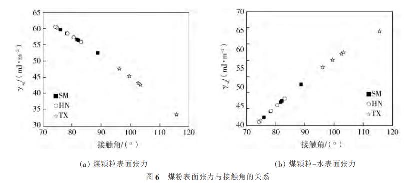 2)隨著變質程度的增加,煤顆粒的表面張力減小;隨著煤顆粒粒度的減小,不同變質程度煤樣的表面張力與接觸角呈負相關,煤-水界面張力與接觸角呈正相關;接觸角增大,煤顆粒表面張力減小,煤-水界面張力增大。