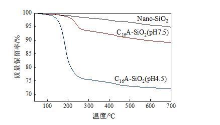 圖2為Nano-SiO2、C16A-SiO2(pH4.5)、C16A-SiO2(pH7.5)的TG曲線。