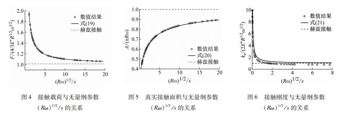 實(shí)際工程中不同粗糙表面對應(yīng)的微凸體曲率半徑各不相同,在上述的數(shù)值求解過程中,以微凸體曲率半徑R=10 mm為例來研究表面張力對接觸特性的影響,其他參數(shù)G=1 MPa, μ=0.4, β=0.1 J/m2。獲得了無量綱接觸載荷F/(4/3 E* R1/2 ω3/2)和無量綱接觸面積A/πRω與無量綱參數(shù)(Rω)1/2/s的數(shù)值關(guān)系,通過對數(shù)值解的擬合,得到了考慮表面張力時載荷F和真實(shí)接觸面積A與壓入深度ω的關(guān)系式分別如式(19)和式(20)所示,且不同的R值只會影響式(19)和式(20)中的擬合系數(shù)。