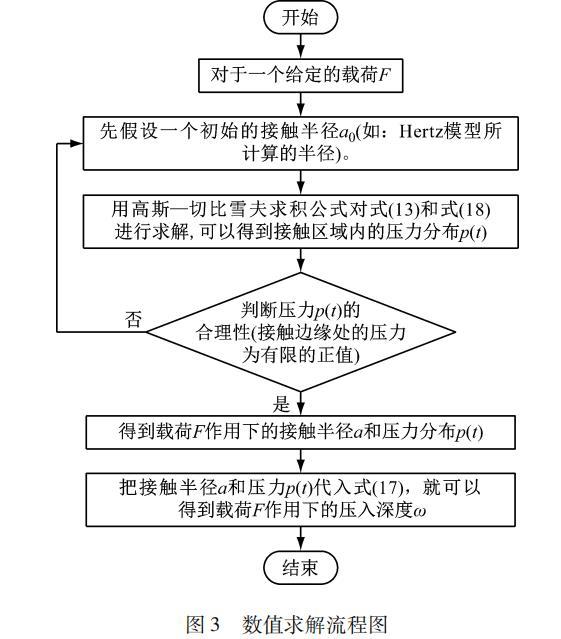 由于式(18)為奇異積分,難以獲得它的解析解,故本文采用高斯-切比雪夫求積公式對單個微凸體模型進(jìn)行數(shù)值求解,詳細(xì)的求解步驟如下,圖3給出了數(shù)值求解流程步驟為: