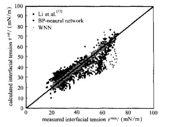 本研究創新性地構建了小波神經網絡模型來進行界面張力預測。該模型本質上是將小波分析理論與傳統的BP神經網絡相結合。其核心優勢在于,用具有良好局部時頻特性的小波基函數(本研究采用Morlet小波)替代了傳統S型函數作為隱含層的激活函數。小波基函數具有伸縮和平移的能力,能更有效地捕捉和逼近數據中不同頻率的特征,從而在理論上賦予了網絡更強的函數逼近能力和容錯性能,有助于克服傳統BP神經網絡易陷入局部極小值、對初始權重敏感等固有缺陷。模型的構建與訓練過程嚴謹:首先將全部數據隨機劃分為訓練集和測試集;通過試算法優化網絡結構,即系統性地改變隱含層神經元數量進行多次訓練,最終確定了輸入層6個節點、隱含層16個節點、輸出層1個節點(即6-16-1)的網絡架構為最優,該結構在保證精度的同時避免了過擬合。模型通過最速下降法與動量因子結合的方法進行迭代訓練,不斷調整層間連接權重及小波函數的伸縮平移參數,直至預測誤差最小化。
