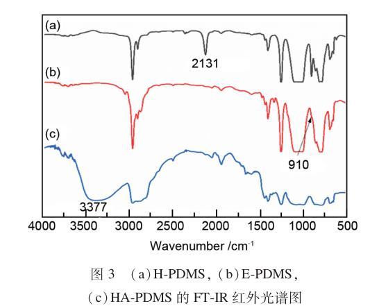 圖3為產物的紅外光譜圖。通過圖3(a)與(b)對比可以看出,圖3(a)中2127cm-1處硅氫鍵的伸縮振動峰在圖3(b)中消失,表明環氧基團成功連接到H-PDMS兩端。通過圖3(b)與(c)對比可以看出,圖3(b)中910cm-1處環氧基的伸縮振動峰在圖3(c)中消失,并出現3377cm-1處羥基的伸縮振動峰,表明二乙醇胺已將環氧基團開環,成功制備了HA-PDMS。