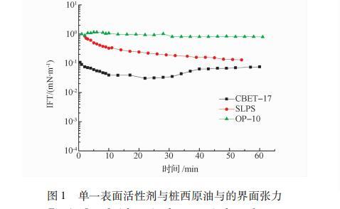 以模擬地層水做溶劑配制質(zhì)量分數(shù)為 0.1%的CBET-17、SLPS、OP-10表面活性劑溶液,測其與樁西原油的動態(tài)界面張力,結(jié)果如圖1所示。一般動態(tài)界面張力通常以動態(tài)界面張力起始值、動態(tài)界面張力最低值、動態(tài)界面張力平衡值以及體系到達動態(tài)界面張力最低值的時間作為評價指標。