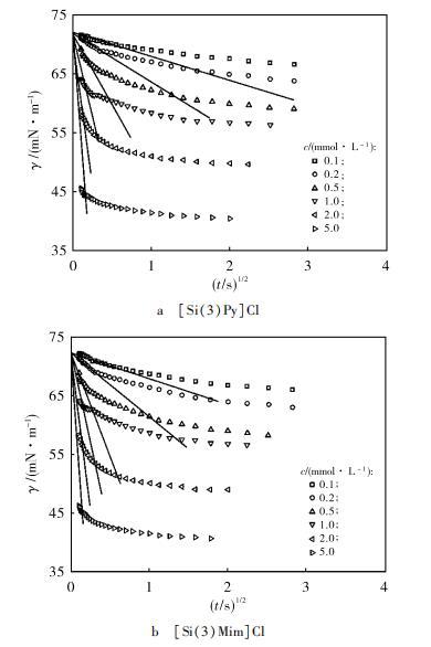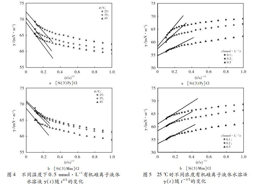 從圖3可知,對于[Si(3)Py]Cl和[Si(3)Mim]Cl水溶液,在濃度為0.1,0.2和0.5 mmol·L?1時,γ(t)與t1?2均在吸附初始階段呈線性關(guān)系。在濃度為1,2和5 mmol·L?1 2種溶液的γ(t)與t1?2在吸附初始階段內(nèi)卻不能用式(4)進(jìn)行擬合。測定值顯示,1,2和5 mmol·L?1 [Si(3)Py]Cl和[Si(3)Mim]Cl水溶液在儀器初始測量時表面張力已經(jīng)小于65 mN·m?1,這表明此時吸附層中已經(jīng)含有一定量有機(jī)硅離子液體分子。公式(3)是在假設(shè)吸附層作為稀溶液的情況下才成立的。此時高濃度情況下致使式(3)出現(xiàn)偏差,從而導(dǎo)致式(4)也不再適用。根據(jù)之前的研究,1,2和5 mmol·L?1 [Si(3)Py]Cl和[Si(3)Mim]Cl水溶液不能用式(4)擬合的主要原因可能是溶液表面中已經(jīng)吸附的有機(jī)硅離子液體分子形成了雙電子層結(jié)構(gòu),該雙電子層結(jié)構(gòu)產(chǎn)生的表面電荷成為吸附勢壘,從而影響了動態(tài)吸附過程。