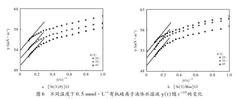 圖6 0.5 mmol·L?1有機(jī)硅離子液體水溶液在不同溫度下的γ(t)與t?1?2關(guān)系圖