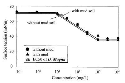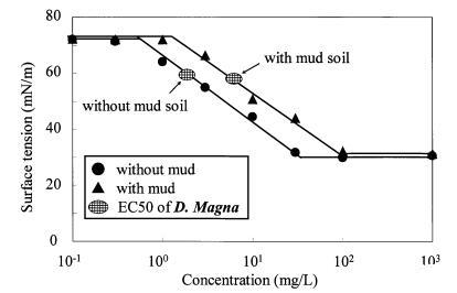 圖11泥質土壤存在對LAS表面張力曲線和大型水蚤有毒表面張力值的影響。