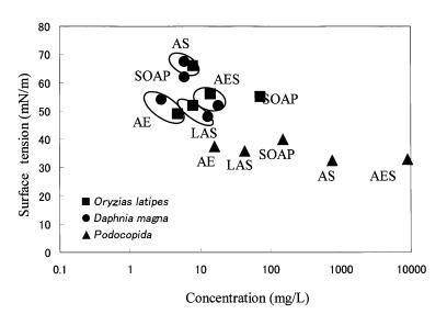 圖2顯示了五種不同表面活性劑(LAS、AE8、AES、AS和SOAP)的γtox和水生毒性值之間的關系。 野生稻的γtox值與大型水蚤相近。 LAS、AE8、AES-AS和SOAP的γtox值分別為50、50、50、65-70和60mn/m。 另一方面,所有五種表面活性劑的podocopida的γtox值均低于40 mN/m。