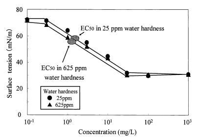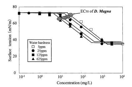 圖9水硬度對烷基硫酸鹽表面張力曲線的影響以及對大型水蚤的有毒表面張力值。