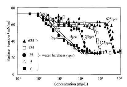 圖7水硬度對肥皂表面張力曲線的影響。